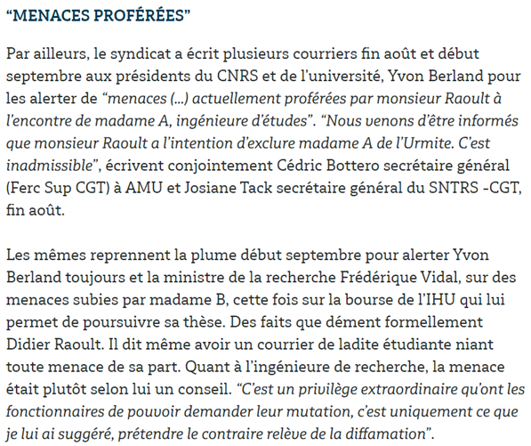 Sans limite dans l’abjection : Raoult n’a pas prévenu le procureur de ces faits de suspicion de harcèlement et agression sexuelle (désormais confirmés et jugés : prison ferme), et redonné un boulot à l’IHU l’agresseur viré du CNRS, mais il aurait… menacé les victimes ! 🔽