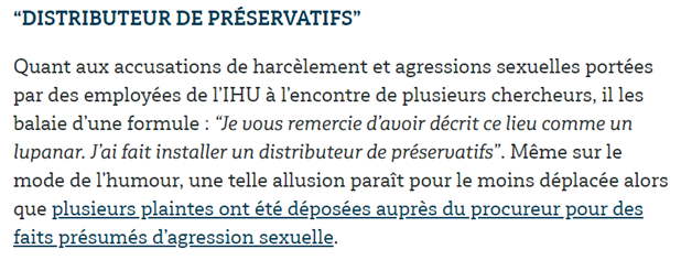 C’est pas fini : Raoult n’a pas prévenu le procureur de ces faits d’agression sexuelle, a fait revenir l’agresseur dans l’IHU alors qu’il avait été viré du CNRS, aurait menacé les victimes. Mais fait installer un… distributeur de préservatifs.🔽