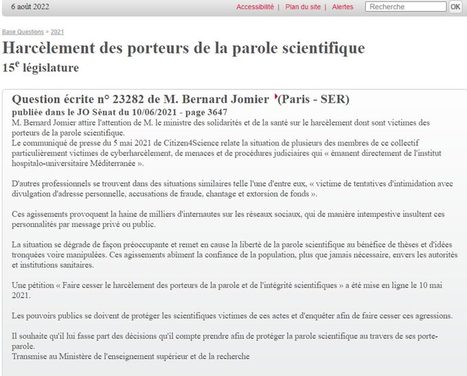 Ces poursuites judiciaires abusives de Raoult aux frais de l’IHU, et ce cyberharcèlement par des membres de l’IHU, sans aucune réaction de leurs employeurs, a conduit le sénateur @BernardJomier à poser une question écrite au gouvernement à ce sujet. 🔽