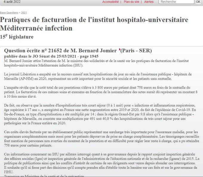 Pourtant, le gouvernement n’a pas répondu à la question du sénateur malgré les délais dépassés (ce qui est illégal), et a attendu près de 2 ans pour demander des « explications » sur ces surfacturations à la sécu’ présumées, faites à l’IHU de Raoult. 🔽