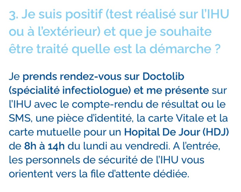 Pire : ces hospitalisations quel que soit l’état du malade (et prescriptions d’hydroxychloroquine d’après des ordonnances diffusées à l’époque sur les réseaux sociaux), perduraient-elles même après que la sécu’ ait demandé des « explications » ? (capture site internet IHU, juillet 2022) 🔽