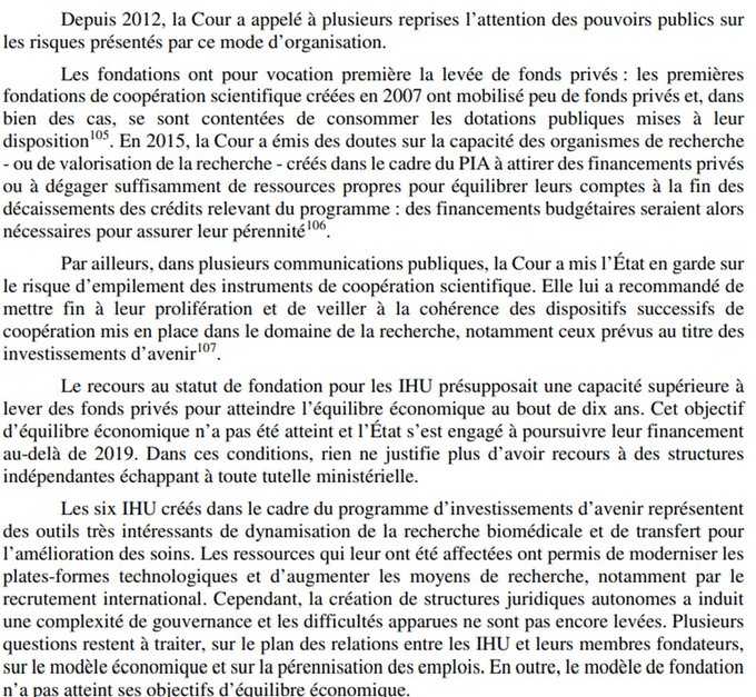 La @Courdescomptes ne s’y était pas trompée: elle avait bien vu que les statuts des 6 premiers IHU avaient fabriqué un monstre incontrôlable, et recommandait de mettre fin au statut de fondation de droit privé. Ca devait se faire. Mais au final non ! 🔽